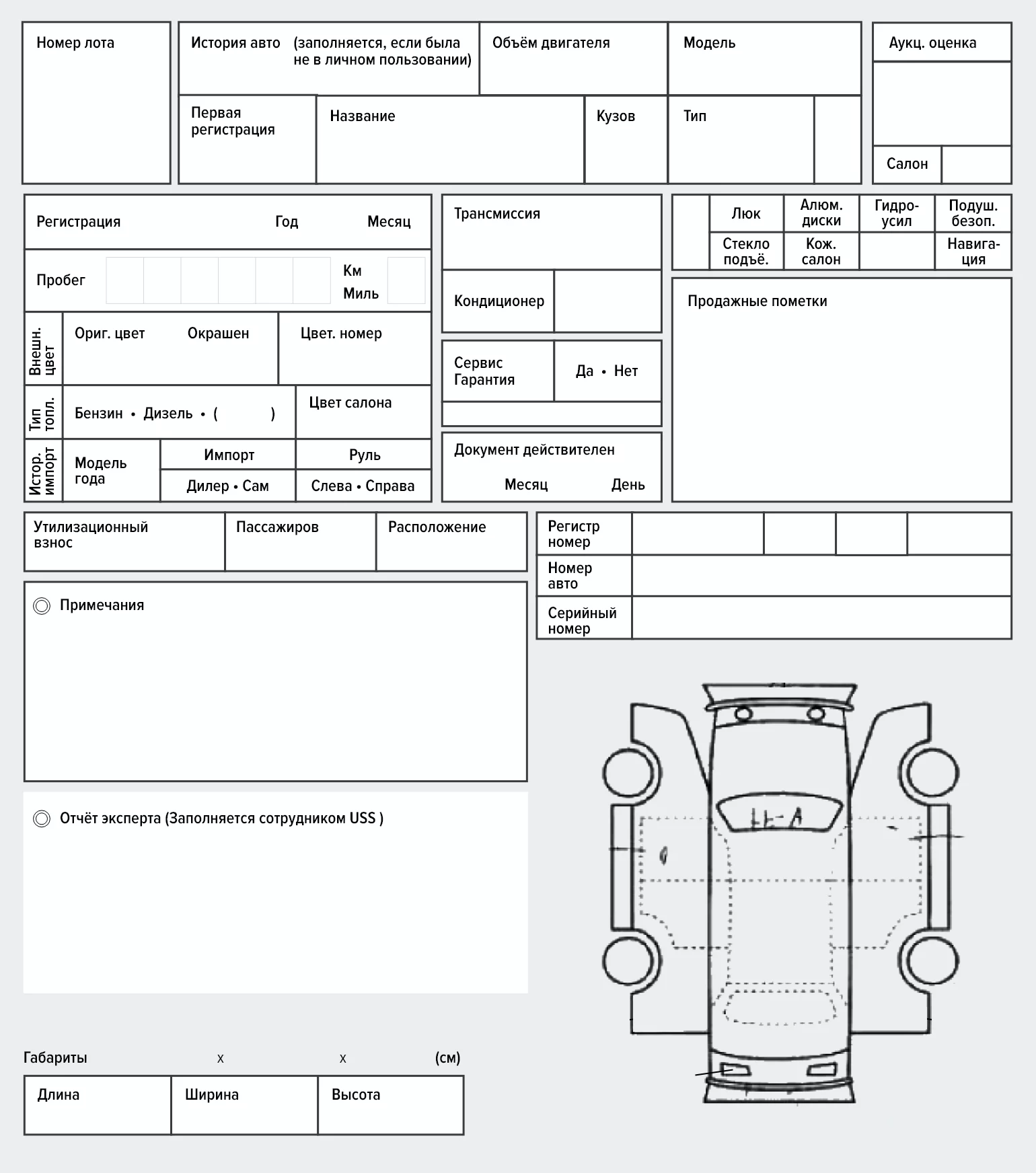 Он содержит исчерпывающие данные об автомобиле, такие как год, VIN-номер, пробег, техническое состояние и история автомобиля. Совокупность всех этих данных преобразуется в пятибалльную систему оценки. Как показывает опыт, чаще всего с молотка уходят экземпляры с оценкой 4.5, 4, 3.5 балла.